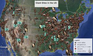 Archaeological Finds: Skeletons up to 12 feet tall have been unearthed across North America (Michigan, Iowa, California), often with features like double rows of teeth and elongated skulls.